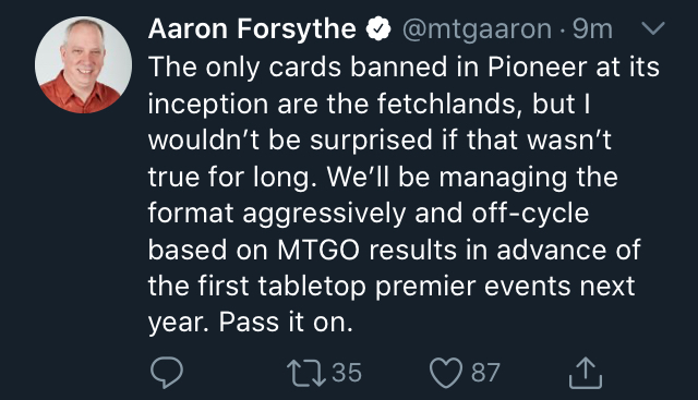 “If you don’t think something in your Pioneer deck needs to be banned, then you’re not trying hard enough. The victory condition at this point is getting a card banned. If you don’t think your deck will do that build a new deck”.