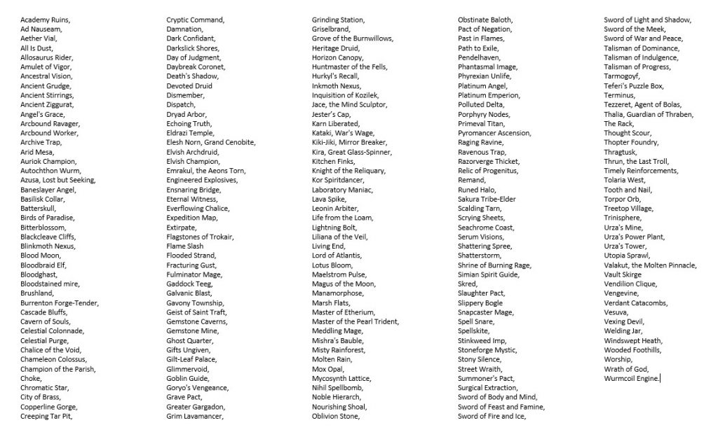 My first step was to go to my favourite search tool Scryfall.com, and put the following into the advanced search: legal in modern, 8th addition to M13. To narrow down the results I filtered to show only cards greater than or equal to $2. I then went through and noted all the cards that I’d either played or played against in modern in the last couple of years and added the Khans fetchlands to create the list below. It’s not entirely fool-proof, as a few cards key Modern cards (e.g. Ancient Stirrings, Devoted Druid, Sakura Tribe-Elder, Thought Scour, Slippery Bogle and the infect cards), slip through below $2, but it does give a good indication. I followed up by looking at the Frank Karsten’s number-crunching article about Mythic Championship II (the last Modern Mythic Championship before Modern Horizons was released) to see which cards were most played there, in case I were missing anything key; doing that reminded me that ‘infect’, ‘dredge’ and phyrexian mana are all things we won’t see in Pioneer. Incidentally, according to that data from MCII, 55% of the top-100 mainboard cards will not be legal in Pioneer.