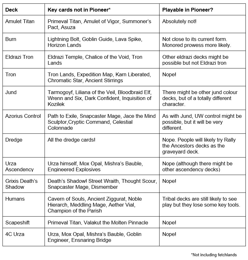 Partly because of the likelihood of forthcoming bans, and partly because there are already other sources (check out PioneerDLs on Twitter), I’m not going to be proposing specific decklists in this article. Instead, I’m going to take a comprehensive look at what isn’t included in Pioneer as a way to think strategically about how Pioneer will differ from Modern in the longer term.